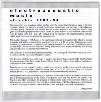 During the profiling of Slovak electroacoustic production, permanently struggling for its justified and reasonable existence, the Experimental Studio has come to an autonomous and authentic programme and activities in a close cooperation with the role of the radio in Slovak and international cultural context. It initiated and served as a base for the formation of the Centre for Electroacoustic and Computer Music in Slovakia - CECM. One of the outcome of its initial activities is also this selection of compositions in a form of the first collection of electroacoustic and computer music from the production of the Experimental Studio of the Slovak Radio in Bratislava summarizing its activities for more than 25 years.