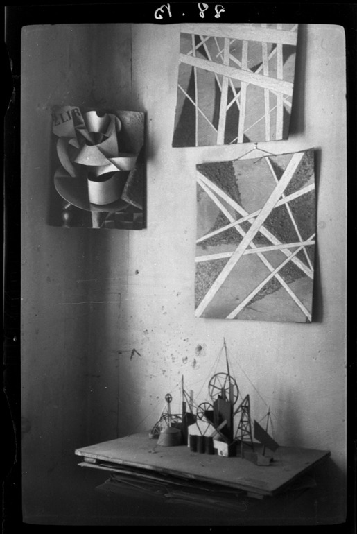 Katarzyna Kobro spatial constructions at the exhibition of ar group at IPS Warszawa 1933 among paintings by Stazewski and Strzeminski.jpg