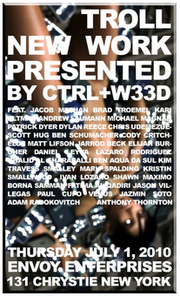 | 09:59, 25 January 2025 | Troll-groupshow-2010.png (file) | 152 KB | Troll, a group show curated at Envoy Enterprises in New York by Keehnan Konyha and Jacob Gaboury. It presented new work by Jacob Meehan, Brad Troemel, Karo Altmann, Andrew Laumann, Michael Magnan, Patrick Dyer, Dylan Reece, Chris Udemezue, Scott Hug, Ben Schumacher, Cody Critcheloe, Chris Bogia, Matt Lifson, Jarrod Beck, Elijah Burgher, Daniel Leyva, Lazaro Rodriguez, Ben Aqua, Da Sul Kim, Travess Smalley, Mark Spalding, Kristin Smallwood, Ivan Lozano, Khalid Al Gharaballi, Shawn Maximo, Born... | 1 | |