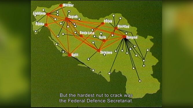 The projects in the exhibition, through networks of likeminded artists all over Europe, forged connections via the distribution of analogue videotapes through semi-official channels like Infermental. Others used TV broadcast and early internet technologies, as did Van Gogh TV with Piazza Virtuale, or created a dialogue between past and future selves. And Transcentrala by Marina Gržinić & Aina Šmid explores how artist collective NSK (Neue Slowenische Kunst) developed a theory of history and concept of a postnational world transcending borders. In 1992, the collective founded NSK State in Time, which inspired this script’s name.
