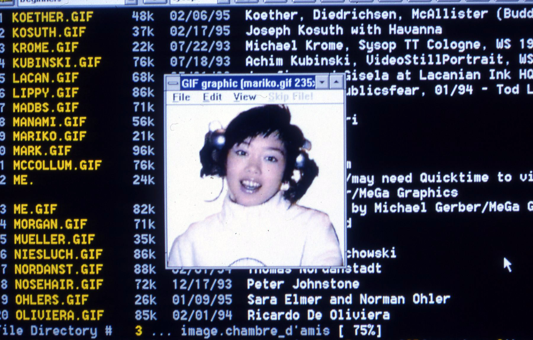 | 12:18, 9 September 2024 | The Thing BBS circa 1994.jpg (file) | 421 KB | Featuring artwork by Mariko Mori. Photo: Wolfgang Staehle. [https://anthology.rhizome.org/the-thing Source]. | 1 | |