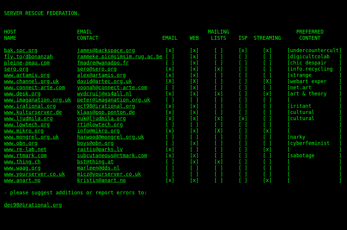 | 16:45, 13 September 2024 | Server Rescue Federation c1998.png (file) | 156 KB | [http://web.archive.org/web/19990204030534/http://irational.org/server.html Source]. | 1 | |
