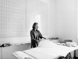 Irma Blank photographed in her studio, Milan, 1977, in front of Law I and Law II, 1975, ink on parchment-like paper. Photograph: Maria Mulas. Source.